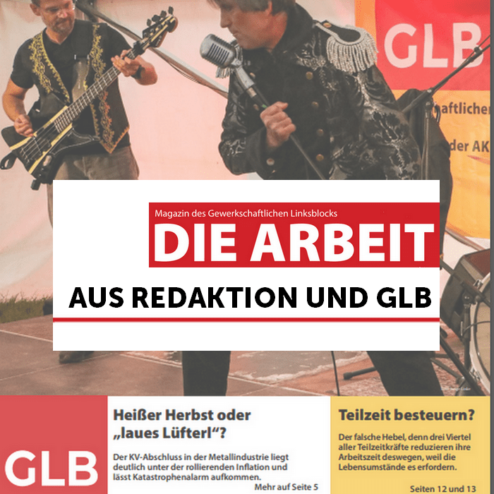 Aktuelle Meldung: Der Bundesvorstand des GLB, sowie die Vorstände der GLB-gpa und GLB-PRO-GE haben einstimmig beschlossen, dass sie den Metaller:innen-KVAbschluss ablehnen, weil er einerseits für die Kolleginnen und Kollegen einen deutlichen Reallohnverlust bedeutet und andererseits von WKO und IV sowie Unternehmen anderer Branchen instrumentalisiert wird, um ebenfalls mit Lohnverlusten abschließen zu können.“