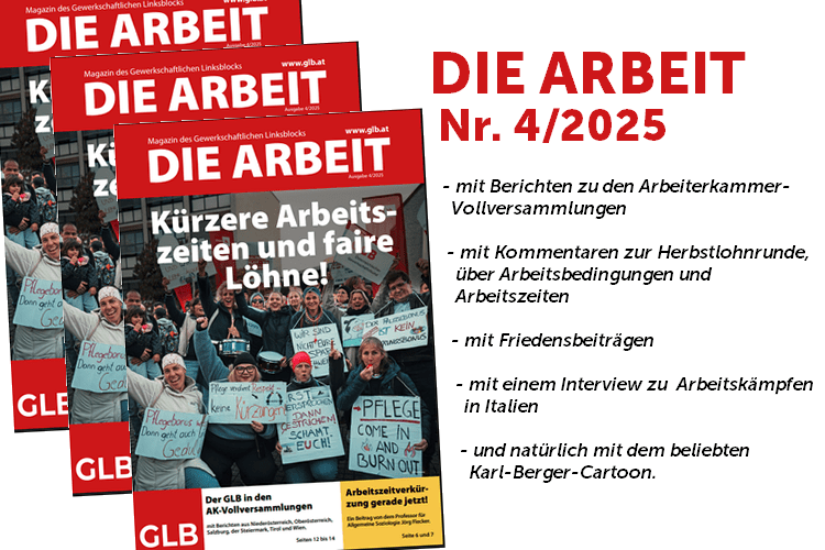 Wie immer informieren wir auch über Aktivitäten des GLB, insbesondere über das Auftreten unserer AK-Rät:innen in den Vollversammlungen der Arbeiterkammern Niederösterreich, Oberösterreich, Salzburg, Tirol und Wien. Und natürlich „schließt die aktuelle Nummer wieder mit einem neuen Karl Berger Cartoon. Wie immer erhalten diese Ausgabe alle Abonnent:innen und GLB-Mitglieder im der Post. Also den Postkasten im Auge behalten.